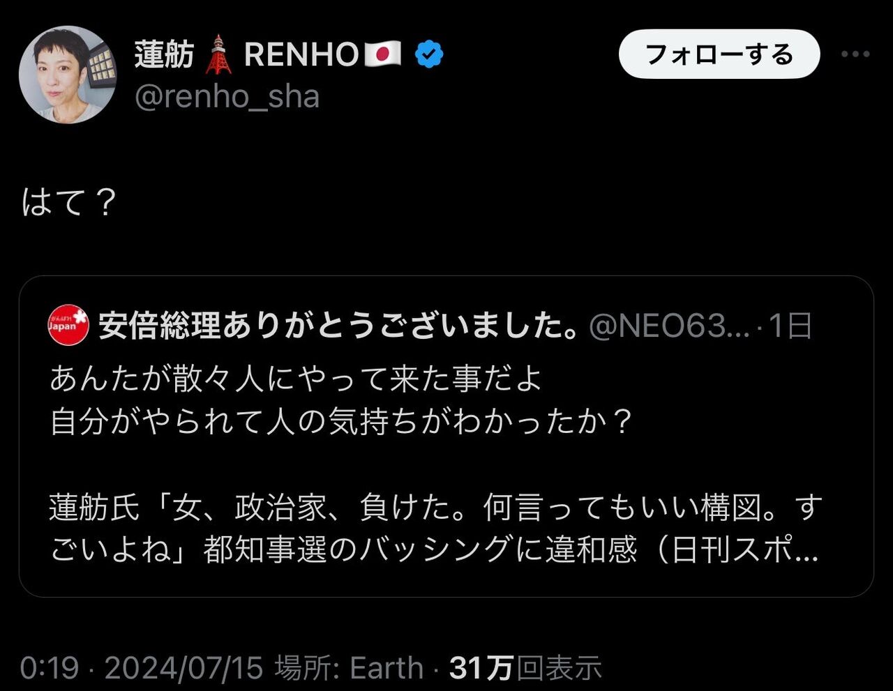 蓮舫さん、なぜ直リプしたこちらのコメントは読んでいただけていないのでしょうか?